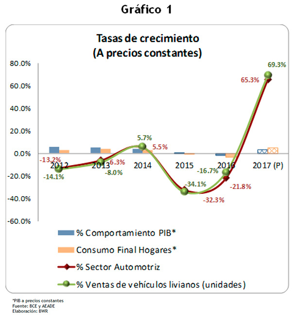 En el 2017, el sector automotor ecuatoriano mostró un mayor dinamismo debido al Acuerdo Comercial con la Unión Europea, la eliminación del sistema de cupos establecido en la Resolución 50 de Comex y el hecho de que el Impuesto al Valor Agregado (IVA) volvió al 12% a partir de junio-2017. Según datos oficiales de la AEADE con corte diciembre 2017, se comercializaron 105,077 unidades (63,555 unidades vendidas en 2016), equivalente a un crecimiento del 65.3%.