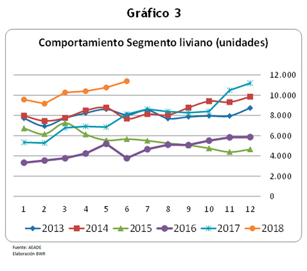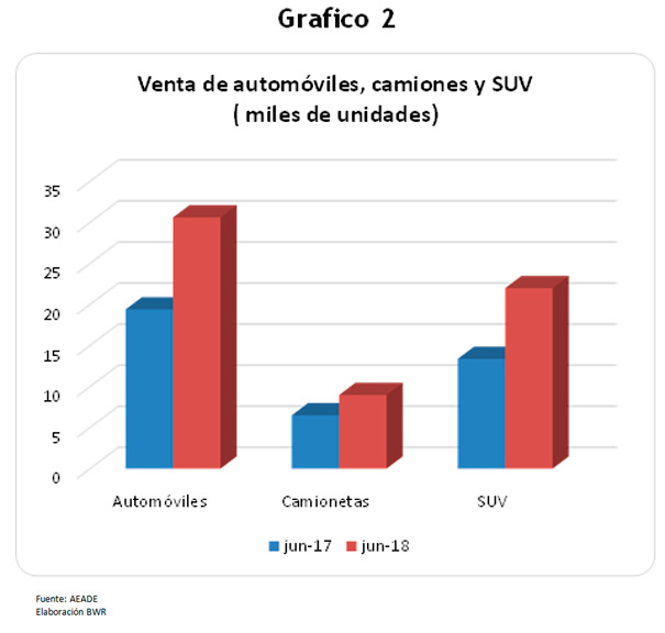 En el gráfico 2 se muestra el comportamiento que han tenido las ventas de los diferentes tipos de vehículos livianos, donde se evidencia la fuerte recuperación del negocio tras la eliminación de las restricciones a la importación de vehículos. Con corte junio-2018 las ventas en este segmento presentan un incremento de 56.7% respecto al mismo período del año anterior.