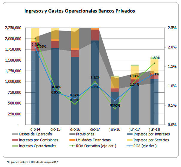 El gráfico anterior muestra que los indicadores de rentabilidad del sistema se fortalecen durante el 2017 y que a junio-2018 la tendencia sigue siendo positiva. Se espera que en el segundo semestre la rentabilidad se desacelere.