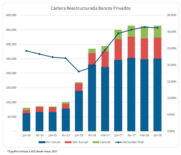 La morosidad de la cartera del sistema que a dic-2017 se reduce a 2.96% a jun-2018 muestra un ligero aumento a 3.02%, a pesar del crecimiento registrado de la cartera bruta. Estos indicadores de morosidad incluyendo la cartera reestructurada que muestra una mora de alrededor del 31%, suben a 3.99% y a 3.97% a dic-2017 y jun-2018 respectivamente.