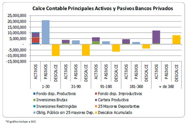 El fondeo de los bancos que es principalmente a la vista y de corto plazo genera un descalce estructural de plazos frente a los activos productivos. El gráfico que sigue ilustra dicho descalce a jun-2018: