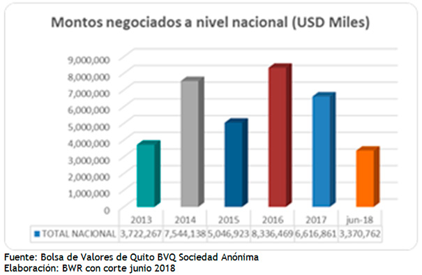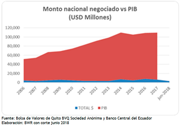 El mercado de valores ecuatoriano en comparación al de países vecinos resalta los potenciales de crecimiento y limitado desarrollo del mismo. Consecuentemente los volúmenes negociados en relación al PIB son bajos; en 2016 alcanzan su máximo de 8.3%. Para el 2017 esta relación fue del 6.4% (Colombia > 150% del PIB, Chile> 230% del PIB). A fecha de corte no se dispone de información del PIB ya que el BCE no ha presentado su previsión al encontrarse a la espera la aprobación de la Ley Orgánica para el Fomento Productivo, Atracción de Inversiones, Generación de Empleo, y Estabilidad y Equilibrio Fiscal.