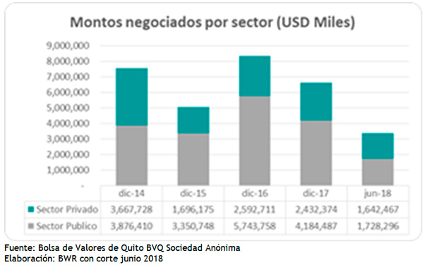 El sector público ha sido tradicionalmente el principal actor dentro del mercado de valores ecuatoriano, al negociar títulos tales como certificados de tesorería, certificados de inversión, bonos y títulos del Banco Central. Al 2017 dicho sector representa el 63.2% del total negociado. Por otro lado, en el 2016 se evidenció que la representatividad del sector privado se redujo en base a la coyuntura económica, niveles de liquidez del sistema financiero y preferencia al endeudamiento con el sistema bancario por las condiciones del mercado. Se observa que a partir del 2017 la brecha entre sectores tiende a contraerse.