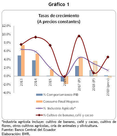 La economía ecuatoriana presentó un modesto crecimiento de 1.4% en términos constantes en el 2018 según los resultados provisionales de las Cuentas Nacionales publicadas por el BCE. La previsión de crecimiento para el 2019 es de 0.16%.